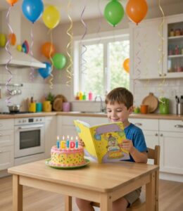 What is a child’s perfect birthday party? Balloons, Cake, Ice Cream, Clowns, Gifts, and all kinds of other fun things of course. All of these dreams will come true when a real surprise party is waiting for your child at the end of the story. The MOST important surprise of all is that the day is shared with loving family and friends.
